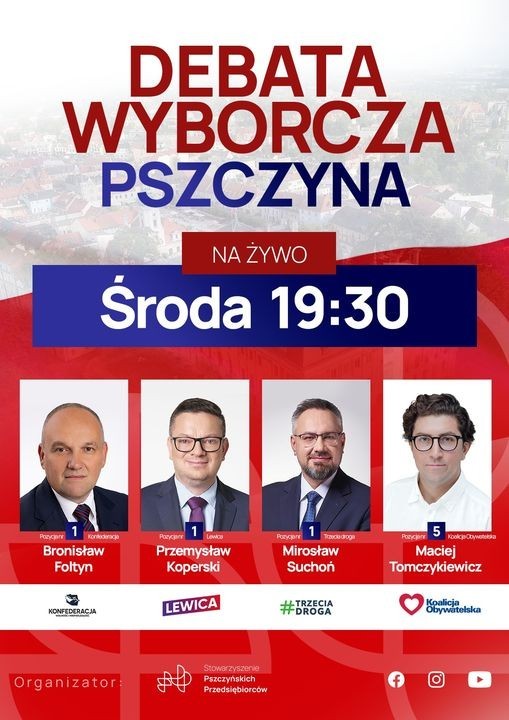 Głównymi tematami debaty będą sprawy lokalne, które mają kluczowe znaczenie dla naszej społeczności. Nasi uczestnicy będą omawiać kwestie związane z rozwojem miasta Pszczyna, poprawą infrastruktury, ochroną środowiska, polityką społeczną oraz innymi istotnymi zagadnieniami, które bezpośrednio dotyczą nas wszystkich. Chcemy, abyście Państwo czuli się zaangażowani w kształtowanie przyszłości Pszczyny i mieli okazję zadać pytania naszym uczestnikom, dlatego jeśli mają Państwo jakiekolwiek pytania prosimy o umieszczanie ich w komentarzach.